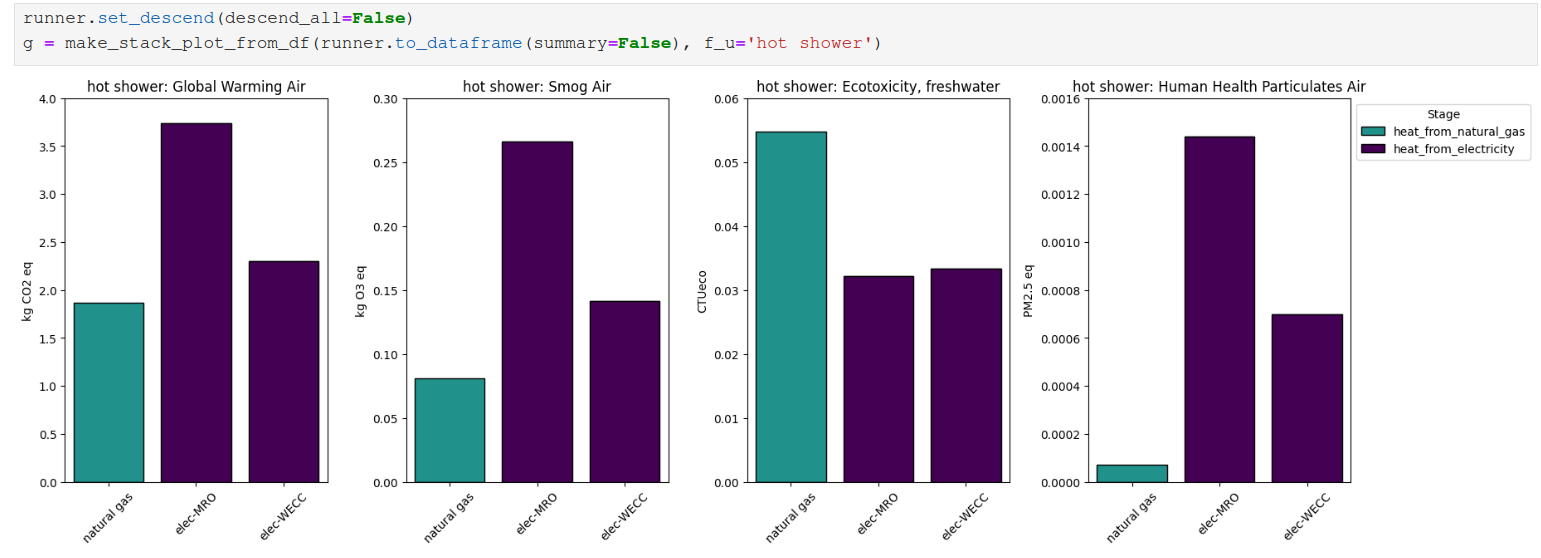 The meat of the demo concerns the development of a model for the impacts of heating water for a shower. I start by constructing a model for heat demand based on the duration of the shower, water flow rate, temperature increase, and heat capacity, ending with a “heat input” node. Then I anchor that node to two different models for water-heating, one using natural gas with an efficiency of 65%, the other using electricity with an efficiency of 90%. The model is built without accessing any life cycle inventory data at all.